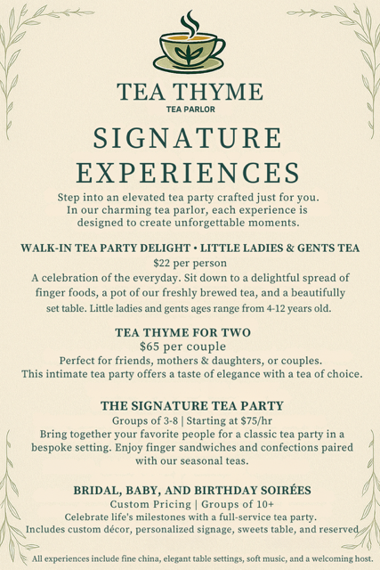 Whether you are celebrating a birthday, hosting a baby shower, gathering with friends, or simply craving a peaceful moment, Tea Thyme is where unforgettable memories are made. From curated teas and delicate bites to vintage-modern decor and intimate seating, every detail is designed to make you feel seen, cherished, and cared for.